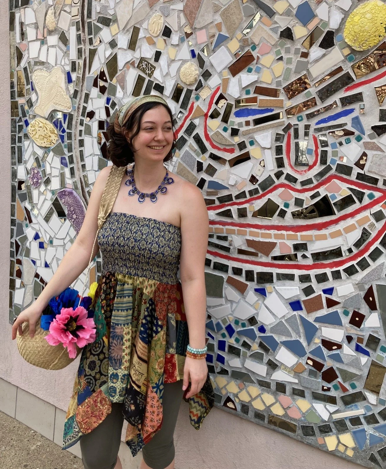 She often finds inspiration in the people she meets, nature, surrealism, and folk art.